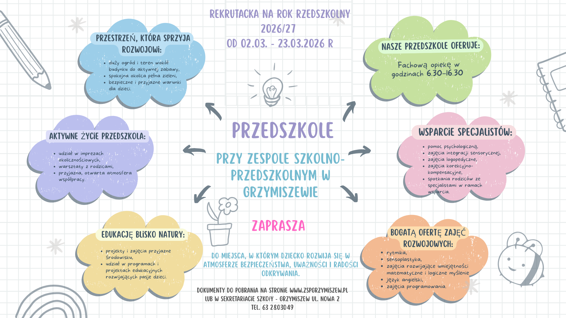 jeśli szukają Państwo miejsca, w którym dziecko będzie bezpieczne, zauważone i szczęśliwe, serdecznie zapraszamy do Przedszkola przy Zespole Szkolno-Przedszkolnym im. Romualda Traugutta w Grzymiszewie.