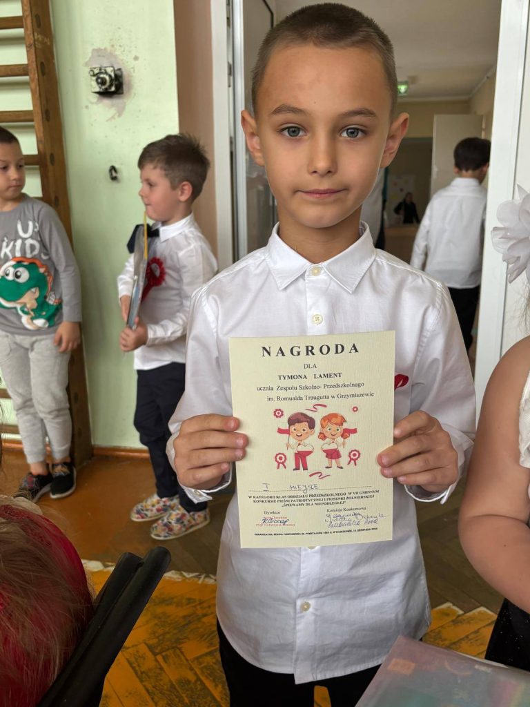 Nasi przedszkolacy wyśpiewali dla Niepodległej Dwoje przedszkolaków z grupy MISIE wzięło udział w VII Gminnym Konkursie Pieśni Patriotycznej i Piosenki Żołnierskiej „Śpiewamy dla Niepodległej”, który odbył się w Szkole Podstawowej w Tuliszkowie. Nasi reprezentanci zaprezentowali się znakomicie i wrócili z konkursu z trofeami. Pierwsze miejsce zdobył Tymon Lament, wykonując piosenkę „Co to jest niepodległość”, drugie